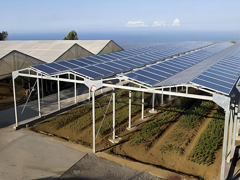Sistem Pemasangan Tanah Suria Timur-Barat untuk tanah Ladang boleh mencapai ketinggian 3.5 meter di atas tanah, yang sesuai untuk laluan mekanikal. Jarak barisan panel solar/jarak jangkar tanah (arah timur-barat) boleh direka bentuk mengikut jarak baris tumbuhan, seperti 3.5 meter. Jarak penambat tanah (arah utara-selatan) ialah gandaan jarak baris tumbuhan.