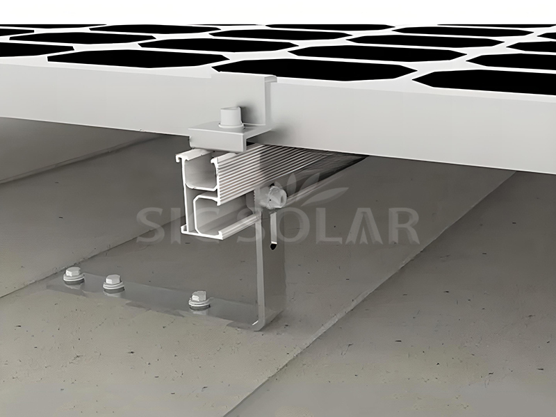 7️⃣ Pasang rel dan panel – Pasangkan rel pelekap pada cangkuk, kemudian kencangkan panel PV dengan pengapit.