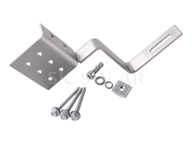 7️⃣ Pasang rel dan panel – Pasangkan rel pelekap aluminium pada cangkuk, kemudian pasangkan panel PV menggunakan pengapit.