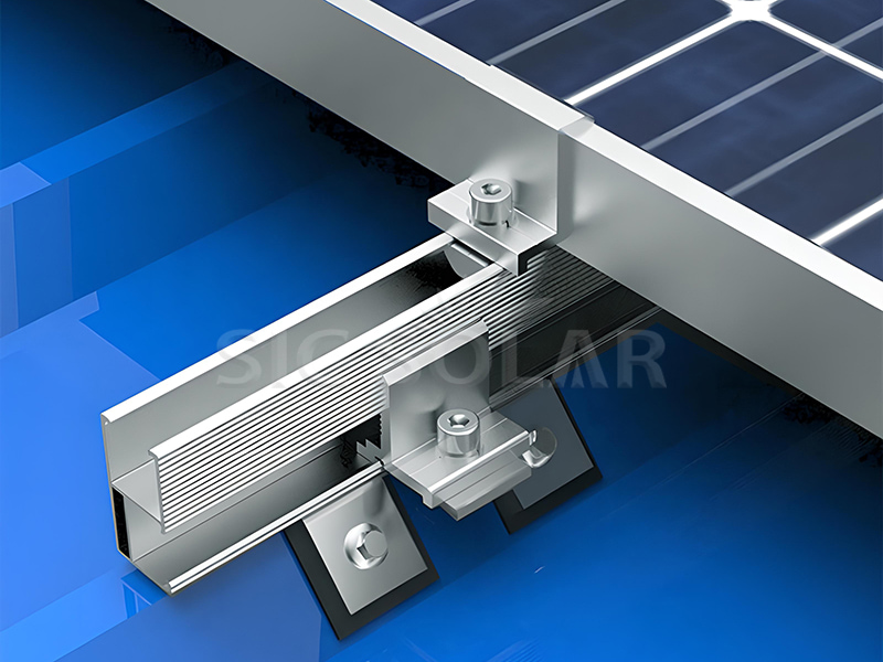 4️⃣ Pasang rel pelekap – Selamatkan rel aluminium pada pengapit menggunakan bolt dan pencuci, menjajarkannya untuk memastikan penempatan panel yang tepat.